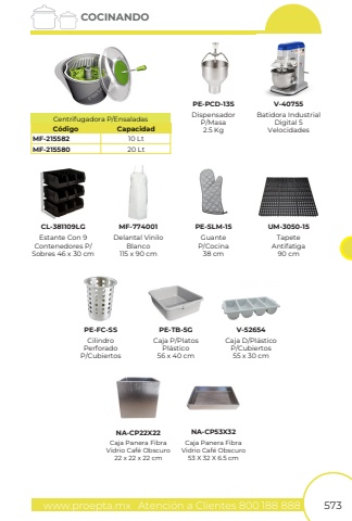 www.proepta.mxAtenci%u00f3n a Clientes 800 188 888573COCINANDOMF-215582MF-21558010 Lt20 LtC%u00f3digoCentrifugadora P/EnsaladasCapacidadBatidora IndustrialDigital 5VelocidadesEstante Con 9Contenedores P/Sobres 46 x 30 cmV-40755CL-381109LGDispensadorP/Masa2.5 KgPE-PCD-13SDelantal ViniloBlanco115 x 90 cmMF-774001GuanteP/Cocina38 cmTapeteAntifatiga90 cmPE-SLM-15UM-3050-15Caja D/Pl%u00e1sticoP/Cubiertos55 x 30 cmV-52654Caja P/PlatosPl%u00e1stico56 x 40 cmCilindroPerforadoP/CubiertosPE-FC-SSPE-TB-5GCaja Panera Fibra Vidrio Caf%u00e9 Obscuro 22 x 22 x 22 cmCaja Panera Fibra Vidrio Caf%u00e9 Obscuro53 X 32 X 6.5 cmNA-CP22X22NA-CP53X32