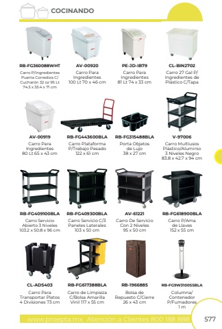 www.proepta.mxAtenci%u00f3n a Clientes 800 188 888577COCINANDOCarro P/IngredientesPuerta Corrediza C/ Cuchar%u00f3n 32 oz 95 Lt 74.3 x 33.4 x 71 cmRB-FG360088WHTCarro ParaIngredientes100 Lt 70 x 46 cmAV-00920Carro ParaIngredientes81 Lt 74 x 33 cmPE-JD-IB79Carro 27 Gal P/Ingredientes dePl%u00e1stico C/TapaCL-BIN2702Carro ParaIngredientes80 Lt 65 x 43 cmAV-00919Carro PlataformaP/Trabajo Pesado122 x 61 cmRB-FG443600BLACarro ServicioAbierto 3 Niveles103.2 x 50.8 x 96 cmCarro Servicio C/3 Paneles Laterales 103 x 50 cmCarro P/Amade Llaves152 x 55 cmRB-FG409100BLARB-FG409300BLARB-FG618900BLACarro De ServicioCon 2 Niveles95 x 50 cmAV-61221Carro MultiusosPl%u00e1stico/Aluminio3 Niveles Negro83.8 x 42.7 x 94 cmV-97006Carro ParaTransportar Platos4 Divisiones 73 cmCL-ADS403Carro de LimpiezaC/Bolsa AmarillaVinil 117 x 55 cmBolsa deRepuesto C/Cierre26 x 43 cmColumna/ContenedorP/Fumadores1 mRB-FG617388BLARB-1966885RB-FG9W3100SSBLAPorta Objetosde Lujo38 x 27 cmRB-FG315488BLA
