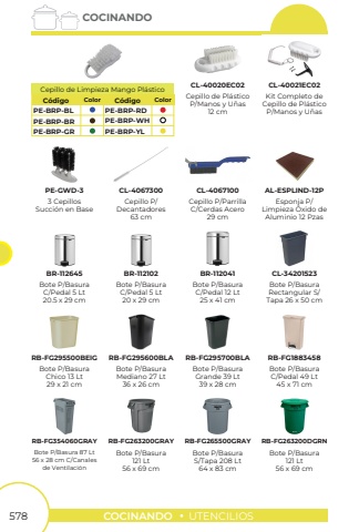 578COCINANDOUTENCILIOSCOCINANDOPE-BRP-BLPE-BRP-BRPE-BRP-GRPE-BRP-RDPE-BRP-WHPE-BRP-YLC%u00f3digoC%u00f3digoCepillo de Limpieza Mango Pl%u00e1sticoColorColorCepillo de Pl%u00e1sticoP/Manos y U%u00f1as12 cmCL-40020EC02Kit Completo deCepillo de Pl%u00e1sticoP/Manos y U%u00f1asCL-40021EC02Cepillo P/Decantadores63 cmCepillo P/ParrillaC/Cerdas Acero29 cmEsponja P/Limpieza %u00d3xido deAluminio 12 PzasCL-4067300CL-4067100AL-ESPLIND-12P3 CepillosSucci%u00f3n en BasePE-GWD-3Bote P/BasuraC/Pedal 12 Lt25 x 41 cmBote P/BasuraC/Pedal 5 Lt20 x 29 cmBote P/BasuraC/Pedal 5 Lt20.5 x 29 cmBR-112645BR-112102BR-112041Bote P/BasuraRectangular S/Tapa 26 x 50 cmCL-34201523Bote P/BasuraChico 13 Lt29 x 21 cmBote P/BasuraMediano 27 Lt36 x 26 cmBote P/BasuraGrande 39 Lt39 x 28 cmBote P/BasuraC/Pedal 49 Lt45 x 71 cmBote P/Basura 87 Lt56 x 28 cm C/Canales de Ventilaci%u00f3nBote P/BasuraS/Tapa 208 Lt64 x 83 cmBote P/Basura121 Lt56 x 69 cmRB-FG295500BEIGRB-FG295600BLARB-FG295700BLARB-FG1883458RB-FG354060GRAYRB-FG263200GRAYRB-FG265500GRAYBote P/Basura121 Lt56 x 69 cmRB-FG263200DGRN