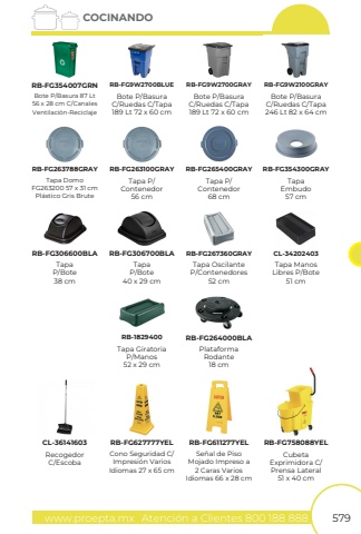 www.proepta.mxAtenci%u00f3n a Clientes 800 188 888579COCINANDOCubeta Exprimidora C/Prensa Lateral51 x 40 cmRB-FG758088YELBote P/Basura 87 Lt56 x 28 cm C/Canales Ventilaci%u00f3n-ReciclajeRB-FG354007GRNBote P/BasuraC/Ruedas C/Tapa189 Lt 72 x 60 cmBote P/BasuraC/Ruedas C/Tapa246 Lt 82 x 64 cmTapa DomoFG263200 57 x 31 cm Pl%u00e1stico Gris BruteTapa P/Contenedor56 cmTapaP/Bote40 x 29 cmPlataformaRodante18 cmRecogedorC/EscobaCono Seguridad C/Impresi%u00f3n VariosIdiomas 27 x 65 cmSe%u00f1al de PisoMojado Impreso a2 Caras VariosIdiomas 66 x 28 cmTapa Oscilante P/Contenedores52 cmTapa ManosLibres P/Bote51 cmTapa GiratoriaP/Manos52 x 29 cmTapa P/Contenedor68 cmTapaEmbudo57 cmTapaP/Bote38 cmBote P/BasuraC/Ruedas C/Tapa189 Lt 72 x 60 cmRB-FG9W2700BLUERB-FG9W2100GRAYRB-FG263788GRAYRB-FG263100GRAYRB-FG306700BLARB-FG264000BLACL-36141603RB-FG627777YELRB-FG611277YELRB-FG267360GRAYCL-34202403RB-1829400RB-FG265400GRAYRB-FG354300GRAYRB-FG306600BLARB-FG9W2700GRAY