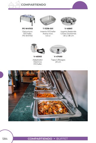 584COMPARTIENDOBUFFETCOMPARTIENDOEstructura P/ChaferPE-W41102Inserto RedondoC/Dos Divisiones 1.8 Lt 38 cmInserto P/ChaferAcero Inox.4.5 LtAdaptador El%u00e9ctricoP/ChaferTapa C/Bisagra29 cmPE-W41103T-11318-001V-46861V-46060V-47490
