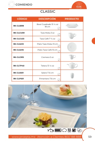 www.proepta.mxAtenci%u00f3n a Clientes 800 188 888COMIENDO59CLASSICBowl Cuadrado 15 1/4 oz18 cmCremera 5 ozTetera 13 1/2 ozTaza Moka 3 ozPlato Taza Moka 13 cmSalero 7.6 cmPimentero 7.6 cmTaza Caf%u00e9 7 3/4 ozPlato Taza Caf%u00e9 15 cmRK-CLSB18RK-CLCR15RK-CLTP40RK-CLCU09RK-CLSA13RK-CLSS01RK-CLCU23RK-CLSA15RK-CLPS01C%u00d3DIGODESCRIPCI%u00d3NPRODUCTO12121212