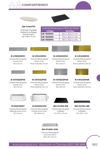 www.proepta.mxAtenci%u00f3n a Clientes 800 188 888593COMPARTIENDOCharola RectangularAcero Inox.50 x 10 cmCharola RectangularAcero Inox.35 x 10 cmCharola RectangularAcero Inox.50 x 20 cmCharola RectangularAcero Inox.35 x 20 cmCharola RectangularAcero Inox.PVD Gold 50 x 10 cmCharola RectangularAcero Inox.PVD Gold 35 x 10 cmCharola RectangularAcero Inox.PVD Gold 50 x 20 cmCharola RectangularAcero Inox.PVD Gold 35 x 20 cmB-V010523P01B-V010523P06B-V010523P03B-V010523P08B-V014123P01B-V014123P06B-V014123P03B-V014123P08Charola OvaladaMelamina BeigeParchment42 x 28 x 3 cmDB-TCM4775DB-TBS9912DB-TBS9913DB-TBS991426.5 x 32.5 x 1 cm17.6 x 32.5 x 1 cm26.5 x 16.2 x 1 cmC%u00f3digoCharola Rectangular C/Pies de Silic%u00f3nMedidasCharola RectangularS/Borde Acero Inox.27 x 21 cmCharola RectangularC/Asas Acero Inox.53 x 32.5 cmB-030523R27B-010523G11MCharola RectangularC/Ribete45 x 35 x 1 cmCharola RectangularGourmet 0.6 Lt48 x 19 x 2.5 cmCharola RectangularC/Ribete21 x 17.5 x 1.5 cmBM-DU204-BBBM-PU002-WWBM-DU200-BB