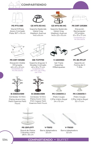 594COMPARTIENDOBUFFETCOMPARTIENDOStand P/PizzaAcero CromadoPlata 18.7 x 19 cmPE-PTS-08RSoporte RedondoMetal GrayMadison Avenue 14.6 x 8 cmGE-MTS-R3-MGSoporte RedondoMetal GrayMadison Avenue14.6 x 23 x 15 cmGE-MTS-R6-MGElevaci%u00f3nRectangularP/Canasta51 x 31 x 17 cmPE-DRT-2012BKCompatible con:PE-SPB-1012TNElevaci%u00f3n DobleP/Canasta40 x 21 x 21 cmCompatible con:PE-SPB-2012TNPE-DRT-1012BKSoporte Angular 3Niveles Cromado43 x 33 x 71 cmCompatible con:DB-T1777, DB-T1778 yDB-T1779DB-TCP1799Set TripleSoportes P/BanquetesV-4600960Soporte enForma de HT-304Plato CoupeC/Pie Vidrio Royal24 x 10 cmPlato CoupeC/Pie Vidrio Royal32 x 11 cmPC-85-PFL57PE-CJ00010-2PE-CJ00010-1Stand de Platos3 Niveles Vidrio28.9 x 35 cmPE-25FLO77Exhibidor 10 MiniPlatos Acero Inox.Petit Essenza Petit FoursExhibidor 10 MiniPlatos Acero Inox. PVD Copper Petit Essenza Petit FoursB-3350541599B-3358541599Barra Adaptadora53 cm Barra Adaptadora33 cmV-75012V-75020
