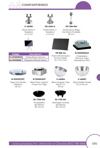 www.proepta.mxAtenci%u00f3n a Clientes 800 188 888595COMPARTIENDOPorta Men%u00fa YTarjetero4 x 3 cmPorta Men%u00fa YTarjetero4 x 3 cmV-46795PE-CMH-3Porta Men%u00fa BaseDe Hierro Fundido20 cmPizarra Rectangular Acr%u00edlico Negro10 x 7.3 x 3 cmPE-TBH-8HPE-BB-4AB-V010519001B-V011219001Porta Men%u00fa 14.5 cmEtiqueta P/Porta Men%u00faC%u00f3digoDescripci%u00f3nEnsaladeraT%u00e9rmica CopaMacedonia 1.8 LtTapa Con PerillaMet%u00e1lica23 cmBowl Para Yogurt/Fruta Con TapaBowl Angular TipoPanal 1 Lt19 cmB-3050552641B-3101215797B-760552017V-46584Bowl Doble Pared3.2 Lt 24 cmV-46667Molcajete Jumbode Resina30 x 15 cmEnsaladerade Resina30 x 6 cmRL-7130-NGRL-7131-NG