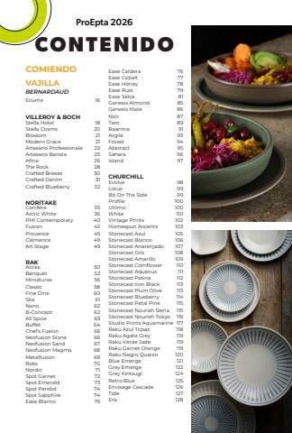 CONTENIDOProEpta 2026VAJILLACOMIENDOBERNARDAUD Ecume16VILLEROY & BOCH NORITAKERAKCHURCHILLStella HotelStella CosmoBlossomModern GraceArtesano ProfessionaleArtesano BaristaAfinaThe RockCrafted BreezeCrafted DenimCrafted BlueberryConifereArctic WhitePMI ContemporaryFusionProvenceCl%u00e9menceArt StageAccesBanquetMiniaturasClassicFine DineSkaNanoB-ConceptAll SpiceBuffetChef%u2019s FusionNeofusion StoneNeofusion SandNeofusion MagmaMetalfusionRoksNordicSpot GarnetSpot EmeraldSpot PeridotSpot SapphireEase BlancoEvolveLotusBit On The SideProfileUltimoWhiteVintage PrintsHomespun AccentsStonecast AzulStonecast BlancoStonecast AnaranjadoStonecast GrisStonecast AmarilloStonecast CornflowerStonecast AqueousStonecast PatinaStonecast Iron BlackStonecast Plum OliveStonecast BlueberryStonecast Petal PinkStonecast Nourish SienaStonecast Nourish TokyoStudio Prints AquamarineRaku Azul TopazRaku Agate GreyRaku Verde JadeRaku Garnet OrangeRaku Negro QuarzoBlue EmergeGrey EmergeGrey KintsugiRetro BlueEnvisage CascadeTideEra18202121222526283031323536404245494950535658606162626364666667686970717273747475989999100100101102103105106107108109110111112113113114115115116117118119119119120121122124125126127128767778798185868789919394959697Ease CalderaEase CobaltEase HoneyEase RustEase SelvaGenesis AlmondGenesis MateNoirTeroBaantnaArgilaForestAbstractSaharaIsland