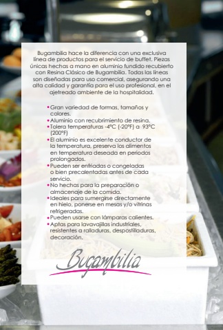604COMPARTIENDOBUFFETCOMPARTIENDOBugambilia hace la diferencia con una exclusiva l%u00ednea de productos para el servicio de buffet. Piezas %u00fanicas hechas a mano en aluminio fundido recubierto con Resina Cl%u00e1sico de Bugambilia. Todas las l%u00edneas son dise%u00f1adas para uso comercial, asegurando una alta calidad y garant%u00eda para el uso profesional, en el ajetreado ambiente de la hospitalidad.Gran variedad de formas, tama%u00f1os y colores.Aluminio con recubrimiento de resina.Tolera temperaturas -4%u00b0C (-20%u00b0F) a 93%u00b0C (200%u00b0F) El aluminio es excelente conductor de la temperatura, preserva los alimentos en temperatura deseada en periodos prolongados.Pueden ser enfriadas o congeladas o bien precalentadas antes de cada servicio.No hechas para la preparaci%u00f3n o almacenaje de la comida.Ideales para sumergirse directamente en hielo, ponerse en mesas y/o vitrinas refrigeradas.Pueden usarse con l%u00e1mparas calientes.Aptas para lavavajillas industriales, resistentes a ralladuras, despostilladuras, decoraci%u00f3n.