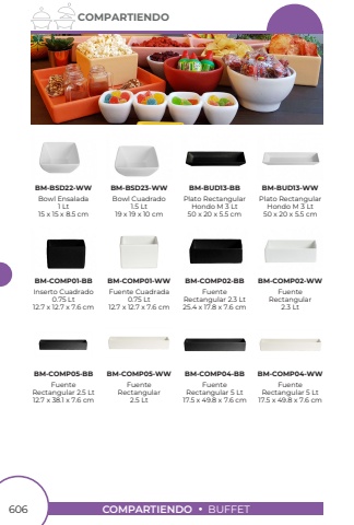 606COMPARTIENDOBUFFETCOMPARTIENDOPlato RectangularHondo M 3 Lt50 x 20 x 5.5 cmFuenteRectangular 2.5 Lt12.7 x 38.1 x 7.6 cmBowl Ensalada1 Lt15 x 15 x 8.5 cmFuenteRectangular 2.3 Lt25.4 x 17.8 x 7.6 cmFuenteRectangular 5 Lt17.5 x 49.8 x 7.6 cmPlato RectangularHondo M 3 Lt50 x 20 x 5.5 cmFuenteRectangular2.3 LtInserto Cuadrado0.75 Lt12.7 x 12.7 x 7.6 cmFuenteRectangular 5 Lt17.5 x 49.8 x 7.6 cmBM-BUD13-WWBM-COMP05-BBBM-BSD22-WWBM-COMP02-BBBM-COMP04-WWBM-BUD13-BBBM-COMP01-BBBM-COMP02-WWBM-COMP04-BBFuenteRectangular2.5 LtFuente Cuadrada0.75 Lt12.7 x 12.7 x 7.6 cmBM-COMP05-WWBM-COMP01-WWBowl Cuadrado1.5 Lt19 x 19 x 10 cmBM-BSD23-WW