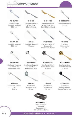 612COMPARTIENDOBUFFETCOMPARTIENDOTenedor Servicio30.5 cmTenedor ServicioVictoryCuchillo ServicioRebanadorAcero Inox. 35 cmCuchilloRebanador23 cmTenedor Servicio29 cmCucharon Sopero C/ AberturaAcero Inox. 1 ozCucharon C/Pico1 oz30 cmCucharonP/Servir 4 oz32 cmCucharonS%u00f3lido 1 oz30 cmPorta CucharaGris MateRevolution 2 19.7 x 10.4 x 3.8 cmCucharon Sopero C/ AberturaAcero Inox. 1 ozCucharon Una Pieza Acero Inox.17.5 cmCucharon UnaPieza PVD Gold17.5 cmCucharonPolicarbonatoNegro 1 oz 24 cmPE-RY-04331-26PE-BW006V-48145B-9030591794PE-BW007V-46905V-46909DB-T211RE-644293PE-BW009B-CI108446B-CI10846OCL-029503Tenedor ServicioAcero Inox. PVD Gold 23 cm MilordTenedor ServicioAcero Inox.23 cm MilordCuchara TipoTenedor Servicio30.5 cmPE-BW010B-C1426B-C144126