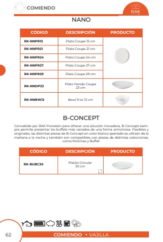 COMIENDOVAJILLACOMIENDO62NANOPlato Coupe 21 cmPlato Coupe 27 cmPlato Coupe 29 cmPlato Hondo Coupe 23 cmBowl 9 oz 12 cmPlato Coupe 15 cmPlato Coupe 24 cmRK-NNPR21RK-NNPR27RK-NNPR29RK-NNDP23RK-NNBW12RK-NNPR15RK-NNPR24C%u00d3DIGODESCRIPCI%u00d3NPRODUCTOB-CONCEPTPlat%u00f3n Circular 30 cmRK-BUBC30C%u00d3DIGODESCRIPCI%u00d3NPRODUCTOConcebida por RAK Porcelain para ofrecer una soluci%u00f3n inovadora, B-Concept siempre permite presentar los buffets m%u00e1s variados de una forma armoniosa. Flexibles y originales, las distintas piezas de B-Concept en color blanco aperlado se utilizan de la ma%u00f1ana a la noche y tambi%u00e9n son compatibles con piezas de distintas colecciones, como Minimax y Buffet.
