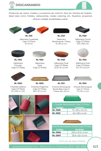 www.proepta.mxAtenci%u00f3n a Clientes 800 188 888623DESCANSANDOJabonera CuadradaCaja C/1 Pieza9 x 9 cmJaboneraRectangular 1 Pieza12 x 8 x 2 cmJabonera CurvaCaja C/1 Pieza13.5 x 8.5 cmJaboneraCircularCaja C/1 PiezaJaboneraOvalCaja C/1 PiezaJabonera OvalCaja C/1 Pieza12.5 x 9 x 2 cmJabonera OvalCaja C/1 Pieza12 x 9 x 2.5 cmCharola ItalianaCaja C/1 Pieza21 x 12.5 x 1 cmCharola Org%u00e1nicaCaja C/1 Pieza29 x 15 x 2 cmCharola Rectangular Borde Bajo Caja C/1 Pieza 46 x 22 cmCharola Rectangular Caja C/ 1 Pieza17 x 30 x 2 cmRL-1101RL-2101RL-1109RL-1102RL-1103RL-1106RL-1105RL-1502RL-1505RL-1511RL-1510Productos de resina, madera y accesorios de m%u00e1rmol. Para los clientes de hospitalidad tales como hoteles, restaurantes, clubes catering, etc. Nuestros accesoriosofrecen calidad, durabilidad y estilo.RL-1508RL-2506RL-1509RL-250717 x 30 x 4.5 cm23.5 x 14.5 x 2 cm24 x 29 x 4 cm32.5 x 22 x 2 cmC%u00f3digoC%u00f3digoCharola Rectangular Caja C/1 PiezaCharola Rectangular Madera Caja C/1 PiezaMedidasMedidas*Art%u00edculos de Sobre Pedido