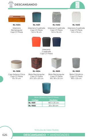 626DESCANSANDOAMENIDADESDESCANSANDOkleenera CuadradaCaja C/1 Pieza14.5 x 16 cmkleeneraRectangularCaja C/1 Piezakleenera CuadradaCaja C/1 Pieza14.5 x 16 cmkleenera CuadradaCaja C/1 Pieza14.5 x 16 cmCaja Italiana ChicaCaja C/1 Pieza8 x 10 cmBote RectangularCaja C/1 Pieza20 x 20 x 25 cmBote RectangularCaja C/1 Pieza18 x 18 x 23 cmBote Cil%u00edndricoCaja C/1 Pieza18.5 x 25 cmRL-1404RL-1401RL-1402RL-1403RL-1206RL-1604RL-1605RL-1603kleeneraCuadradaCaja C/1 PiezaRL-1601RL-160218.5 x 25 cm25 x 30 cmC%u00f3digoBote Cil%u00edndrico Caja C/1 PiezaMedidas*Art%u00edculos de Sobre Pedido