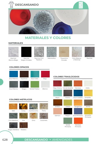 628DESCANSANDOAMENIDADESDESCANSANDOMATERIALESMarmol Blanco BegoMarmol GrisTepeacaMarmolinaOnix Blancoo NaranjaMarmol Negro OrizabaTravertinoDoradoRecintoRojo CherrRojo CherryVerde BotellaNaranjaHieloAquaHumoAzul CobaltoAmbarCitronTangerineArenaAmarilloCOLORES TRASL%u00daCIDOSRojo CherryAmbarSalm%u00f3nVerdePrimarioNegroNaranja PrimarioAzul PrimarioAmarillo PrimarioAquaVerdeBotellaCitr%u00f3nHumoNaranjaTangerineAzul CobaltoHieloArenaAmarilloCOLORES MET%u00c1LICOSMielNegro Met%u00e1licoGris Met%u00e1licoCareyMaderaOroHuitlacocheOnixPerlaCarameloRojoGris RataAzul CieloNegroVerde PastoxBlancoAzul MarinoExpressoCOLORES OPACOSAzul MarinoAzul MarinoExpressoNegroAzul CieloVerde PastoxRojoBlancoMATERIALES Y COLORES