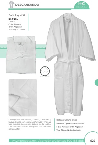 www.proepta.mxAtenci%u00f3n a Clientes 800 188 888629DESCANSANDOBata Piqu%u00e9 XLBK-PQXLBata para Ba%u00f1o o SpaTalla XLModelo: Tipo Kimono Talla XL100% Algod%u00f3nTela Piqu%u00e9. Nido de abejaColor BlancoFibra Natural 100% Algod%u00f3nEmpaque 1 piezaDescripci%u00f3n: Resistente, Liviana, Delicada y Suave. Cuello con costura reforzada y manga tres cuartos. Largo por debajo de la rodilla. Dos bolsillos. Presilla integrada con cintur%u00f3n para ajustar.100% ALGOD%u00d3N100% ALGOD%u00d3N