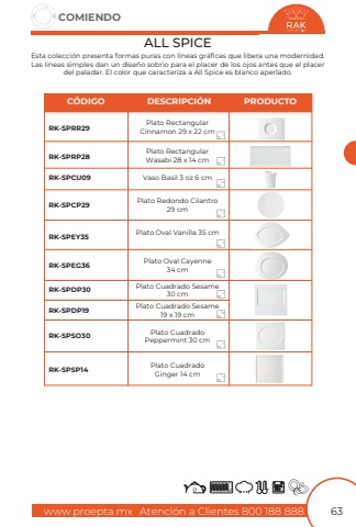 www.proepta.mxAtenci%u00f3n a Clientes 800 188 888COMIENDO63ALL SPICEEsta colecci%u00f3n presenta formas puras con l%u00edneas gr%u00e1ficas que libera una modernidad. Las l%u00edneas simples dan un dise%u00f1o sobrio para el placer de los ojos antes que el placer del paladar. El color que caracteriza a All Spice es blanco aperlado.Plato Rectangular Cinnamon 29 x 22 cmVaso Basil 3 oz 6 cmPlato Cuadrado Sesame 30 cmPlato RectangularWasabi 28 x 14 cmPlato CuadradoPeppermint 30 cmPlato CuadradoGinger 14 cmPlato Cuadrado Sesame 19 x 19 cmPlato Oval Vanilla 35 cmPlato Oval Cayenne 34 cmPlato Redondo Cilantro 29 cmRK-SPRR29RK-SPCU09RK-SPDP30RK-SPSO30RK-SPSP14RK-SPEY35RK-SPEG36RK-SPCP29RK-SPDP19RK-SPRP28C%u00d3DIGODESCRIPCI%u00d3NPRODUCTO1212