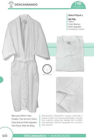 630DESCANSANDOAMENIDADESDESCANSANDOBata Piqu%u00e9 LBK-PQLBata para Ba%u00f1o o SpaTalla LModelo: Tipo Kimono Talla L100% Algod%u00f3nTela Piqu%u00e9. Nido de abejaColor BlancoFibra Natural 100% Algod%u00f3nEmpaque 1 piezaDescripci%u00f3n: Resistente, Liviana, Delicada y Suave. Cuello con costura reforzada y manga tres cuartos. Largo por debajo de la rodilla. Dos bolsillos. Presilla integrada con cintur%u00f3n para ajustar.100% ALGOD%u00d3N100% ALGOD%u00d3N