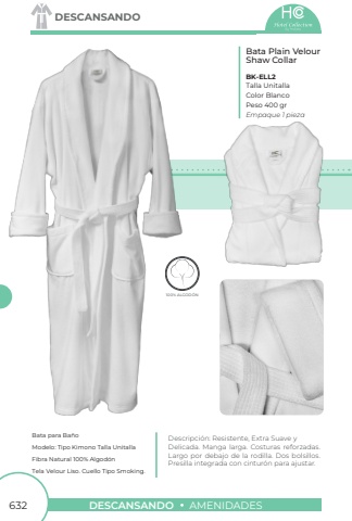 632DESCANSANDOAMENIDADESDESCANSANDOBata Plain VelourShaw CollarBK-ELL2Bata para Ba%u00f1oTalla UnitallaModelo: Tipo Kimono Talla UnitallaPeso 400 grTela Velour Liso. Cuello Tipo Smoking.Color BlancoFibra Natural 100% Algod%u00f3nEmpaque 1 piezaDescripci%u00f3n: Resistente, Extra Suave y Delicada. Manga larga. Costuras reforzadas. Largo por debajo de la rodilla. Dos bolsillos. Presilla integrada con cintur%u00f3n para ajustar.100% ALGOD%u00d3N100% ALGOD%u00d3N