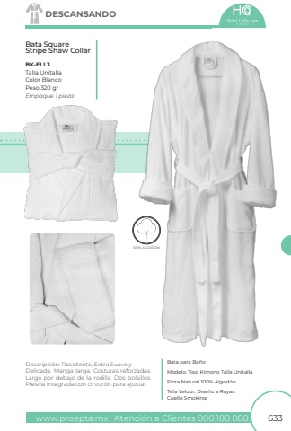 www.proepta.mxAtenci%u00f3n a Clientes 800 188 888633DESCANSANDOBata para Ba%u00f1oModelo: Tipo Kimono Talla UnitallaTela Velour. Dise%u00f1o a Rayas. Cuello Smoking.Fibra Natural 100% Algod%u00f3nDescripci%u00f3n: Resistente, Extra Suave y Delicada. Manga larga. Costuras reforzadas. Largo por debajo de la rodilla. Dos bolsillos. Presilla integrada con cintur%u00f3n para ajustar.100% ALGOD%u00d3NLGOD%u00d3NBK-ELL3Talla UnitallaPeso 320 grColor BlancoEmpaque 1 piezaBata Square Stripe Shaw Collar