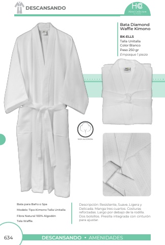 634DESCANSANDOAMENIDADESDESCANSANDOBata Diamond Waffle KimonoBK-ELL5Talla UnitallaPeso 250 grColor BlancoEmpaque 1 pieza100% ALGOD%u00d3NLGOD%u00d3NBata para Ba%u00f1o o SpaModelo: Tipo Kimono Talla UnitallaTela Waffle. Fibra Natural 100% Algod%u00f3nDescripci%u00f3n: Resistente, Suave, Ligera y Delicada. Manga tres cuartos. Costuras reforzadas. Largo por debajo de la rodilla. Dos bolsillos. Presilla integrada con cintur%u00f3n para ajustar.