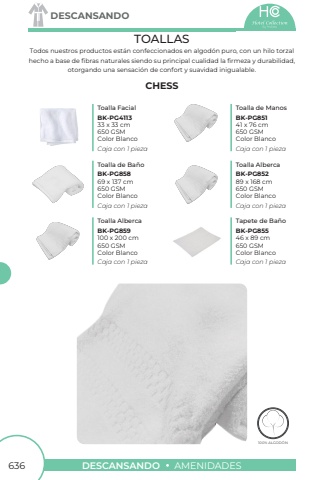636DESCANSANDOAMENIDADESDESCANSANDOBK-PG4113BK-PG858BK-PG859BK-PG851BK-PG852BK-PG85533 x 33 cm69 x 137 cm100 x 200 cm41 x 76 cm89 x 168 cm46 x 89 cm650 GSM650 GSM650 GSM650 GSM650 GSM650 GSMColor BlancoCaja con 1 piezaColor BlancoCaja con 1 piezaColor BlancoCaja con 1 piezaColor BlancoCaja con 1 piezaColor BlancoCaja con 1 piezaColor BlancoCaja con 1 pieza100% ALGOD%u00d3N100% ALGOD%u00d3NTOALLASCHESSTodos nuestros productos est%u00e1n confeccionados en algod%u00f3n puro, con un hilo torzal hecho a base de fibras naturales siendo su principal cualidad la firmeza y durabilidad, otorgando una sensaci%u00f3n de confort y suavidad inigualable. Toalla FacialToalla de Ba%u00f1oToalla AlbercaToalla de ManosToalla AlbercaTapete de Ba%u00f1o