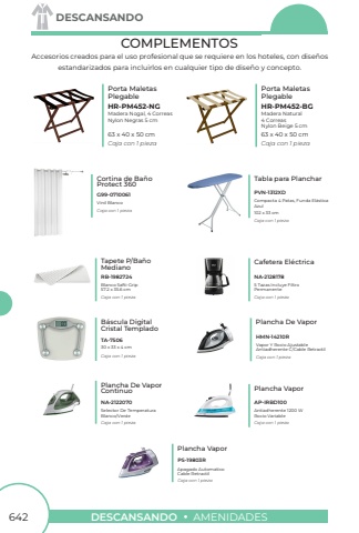 642DESCANSANDOAMENIDADESDESCANSANDOCOMPLEMENTOSAccesorios creados para el uso profesional que se requiere en los hoteles, con dise%u00f1os estandarizados para incluirlos en cualquier tipo de dise%u00f1o y concepto.HR-PM452-NGHR-PM452-BG63 x 40 x 50 cm63 x 40 x 50 cmMadera Nogal, 4 Correas Nylon Negras 5 cmMadera Natural4 CorreasNylon Beige 5 cmCaja con 1 piezaCaja con 1 piezaPorta Maletas PlegablePorta Maletas PlegableG99-0710061Vinil BlancoCaja con 1 piezaCortina de Ba%u00f1o Protect 360TA-7506NA-2122070HMN-14210RRB-1982724NA-2128178AP-IRBD100PS-19803RPVN-1312XD102 x 33 cm30 x 33 x 4 cmSelector De Temperatura Blanco/VerdeVapor Y Rocio Ajustable Antiadherente C/Cable Retractil5 Tazas Incluye Filtro PermanenteBlanco Safti-Grip57.2 x 35.6 cmAntiadherente 1200 W Rocio VariableApagado Automatico Cable RetractilCompacta 4 Patas, Funda El%u00e1stica AzulCaja con 1 piezaCaja con 1 piezaCaja con 1 piezaCaja con 1 piezaCaja con 1 piezaCaja con 1 piezaCaja con 1 piezaCaja con 1 piezaB%u00e1scula DigitalCristal TempladoPlancha De Vapor ContinuoPlancha De VaporTapete P/Ba%u00f1o Cafetera El%u00e9ctrica Mediano Plancha VaporPlancha VaporTabla para Planchar