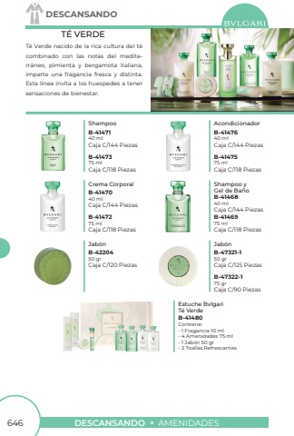 646DESCANSANDOAMENIDADESDESCANSANDOT%u00e9 Verde nacido de la rica cultura del t%u00e9 combinado con las notas del mediterr%u00e1neo, pimienta y bergamota italiana, imparte una fragancia fresca y distinta. Esta l%u00ednea invita a los huespedes a tener sensaciones de bienestar.T%u00c9 VERDEShampooCrema CorporalJab%u00f3nJab%u00f3nShampoo yGel de Ba%u00f1oEstuche BvlgariT%u00e9 VerdeAcondicionadorB-41471B-41470B-42204B-47321-1B-41468B-41480B-41476B-41473B-41472B-47322-1B-41469B-4147540 ml40 ml50 gr50 gr40 mlContiene:- 1 Fragancia 10 ml- 4 Amenidades 75 ml- 1 Jab%u00f3n 50 gr- 2 Toallas Refrescantes40 ml75 ml75 ml75 gr75 ml75 mlCaja C/144 PiezasCaja C/144 PiezasCaja C/120 PiezasCaja C/125 PiezasCaja C/144 PiezasCaja C/144 PiezasCaja C/118 PiezasCaja C/118 PiezasCaja C/90 PiezasCaja C/118 PiezasCaja C/118 Piezas