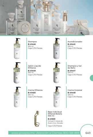 www.proepta.mxAtenci%u00f3n a Clientes 800 188 888649DESCANSANDOShampooB-41446300 mlCaja C/10 PiezasAcondicionadorB-41445300 mlCaja C/10 PiezasJab%u00f3n L%u00edquidoP/ManosB-41449300 mlCaja C/10 PiezasShampoo y Gelde Ba%u00f1oB-41447300 mlCaja C/10 PiezasCrema P/ManosB-41450300 mlCaja C/10 PiezasCrema CorporalB-41448300 mlCaja C/10 PiezasBase IndividualP/Pared Botella300 mlB-41509Incluye 2 Llaves deAcero Inox. DoradoCaja C/12 Piezas