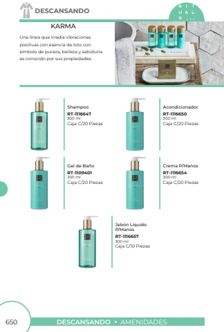 650DESCANSANDOAMENIDADESDESCANSANDOUna l%u00ednea que irradia vibracionespositivas con esencia de loto cons%u00edmbolo de pureza, belleza y sabidur%u00edaes conocido por sus propiedades.KARMAShampooAcondicionadorGel de Ba%u00f1oCrema P/ManosRT-1116647RT-1116650RT-1109401RT-1116654300 ml300 ml300 ml300 mlCaja C/20 PiezasCaja C/20 PiezasCaja C/20 PiezasCaja C/20 PiezasJab%u00f3n L%u00edquidoP/ManosRT-1116657300 mlCaja C/10 Piezas