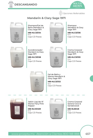 www.proepta.mxAtenci%u00f3n a Clientes 800 188 888657DESCANSANDOMandarin & Clary Sage 1971Opciones RellenablesAcondicionador Mandarin & ClarySage 1971ShampooMandarin & ClarySage 1971Crema Corporal Mandarin & ClarySage 1971Shampoo/Gel de Ba%u00f1o Mandarin & Clary Sage 1971MB-HLC3Z128MB-HLC3Z136MB-HLC3Z133MB-HLC3Z1345 Lt5 Lt5 Lt5 LtCaja C/2 PiezasCaja C/2 PiezasCaja C/2 PiezasCaja C/2 PiezasGel de Ba%u00f1o yManos Mandarin & Clary Sage 1971MB-HLC3Z1325 LtCaja C/2 PiezasJab%u00f3n L%u00edquido P/Manos Fiery PinkPepperMB-NLH212295 LtCaja C/2 PiezasCrema CorporalSerene Coco & SandalwoodMB-NLB0485 LtCaja C/2 Piezas