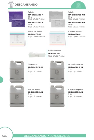 660DESCANSANDOAMENIDADESDESCANSANDOJab%u00f3nJab%u00f3nHA-BIO2JA28-NHA-BIO2JA28-NBHA-BIO2JA50-NHA-BIO2JA50-NB28 gr28 gr50 gr50 grCaja C/500 PiezasCaja C/500 PiezasCaja C/500 PiezasCaja C/500 PiezasGorra de Ba%u00f1oKit de CosturaCepillo DentalHI-BIO2GB-NHI-BIO2SK-NHI-BIO2CD5Caja C/1000 PiezasCaja C/1000 PiezasCaja C/500 PiezasShampooGel de Ba%u00f1oCrema CorporalAcondicionadorHI-BIO2SH5L-NHI-BIO2GB5L-NHI-BIO2CR5L-NHI-BIO2AC5L-N5 Lt5 Lt5 Lt5 LtCaja C/1 PiezasCaja C/1 PiezasCaja C/1 PiezasCaja C/1 Piezas