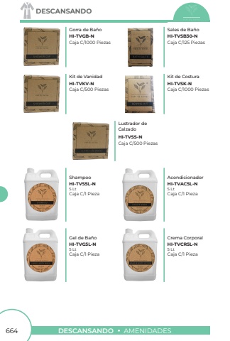 664DESCANSANDOAMENIDADESDESCANSANDOGorra de Ba%u00f1oKit de VanidadKit de CosturaLustrador deCalzadoSales de Ba%u00f1oHI-TVGB-NHI-TVKV-NHI-TVSK-NHI-TVSS-NHI-TVSB30-NCaja C/1000 PiezasCaja C/500 PiezasCaja C/1000 PiezasCaja C/500 PiezasCaja C/125 PiezasShampooGel de Ba%u00f1oCrema CorporalAcondicionadorHI-TVS5L-NHI-TVG5L-NHI-TVCR5L-NHI-TVAC5L-N5 Lt5 Lt5 Lt5 LtCaja C/1 PiezaCaja C/1 PiezaCaja C/1 PiezaCaja C/1 Pieza