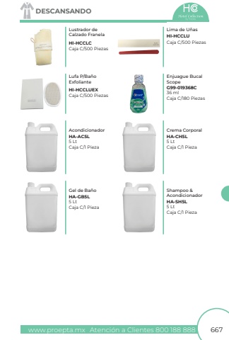www.proepta.mxAtenci%u00f3n a Clientes 800 188 888667DESCANSANDOLustrador deCalzado FranelaLufa P/Ba%u00f1oExfolianteLima de U%u00f1asHI-HCCLCHI-HCCLUEXHI-HCCLUCaja C/500 PiezasCaja C/500 PiezasCaja C/500 PiezasAcondicionadorGel de Ba%u00f1oShampoo &AcondicionadorCrema CorporalHA-AC5LHA-GB5LHA-SH5LHA-CH5L5 Lt5 Lt5 Lt5 LtCaja C/1 PiezaCaja C/1 PiezaCaja C/1 PiezaCaja C/1 PiezaEnjuague BucalScopeG99-019368C36 mlCaja C/180 Piezas