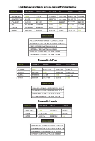 UNIDADMIL%u00cdMETROCENT%u00cdMETROPOPULGADAMedidas Equivalentes del Sistema Ingl%u00e9s al M%u00e9trico DecimalPIEYEYARDAMETRO1 MIL%u00cdMETRO1 MM0.1 CM0.0393 IN0.0033 FT0.0010 YD0.001 M1 CENT%u00cdMETRO10 MM1 CM0.3937 IN0.0332 FT0.0109 YD0.01 M1 PULGADA25.4 MM2.54 CM1 IN0.833 FT0.277 YD0.254 M1 PIE304.80 MM30.48 CM12 IN1 FT0.33 YD0.340 M1 YARDA914.40 MM91.44 CM36 IN3 FT1 YD0.91 M1 METRO1000 MM100 CM39.37 IN3.28 FT1.094 YD1 MCONVERSI%u00d3NPULGADAS A MIL%u00cdMETROS: MULTIPLICAR X 25.4MIL%u00cdMETROS A PULGADAS: MULTIPLICAR X .0393PIES A METROS: MULTIPLICAR X .3048METROS A PIES: MULTIPLICAR X 3.281METROS A YARDAS: MULTIPLICAR X .9144YARDAS A METROS: MULTIPLICAR X 1.094UNIDADGRAMOSONZASLIBRASConversi%u00f3n de PesoKILOGRAMOS1 GRAMO1 GR0.0352 OZ0.0022 LB0.001 KG1 ONZA28.35 GR1 OZ0.0625 LB0.0283 KG1 LIBRA543.59 GR16 OZ1 LB0.453 KG1 KILO1000 GR35.27 OZ2.20 LB1 KGCONVERSI%u00d3NGRAMOS A ONZAS: MULTIPLICAR X .3527ONZAS A GRAMOS: MULTIPLICAR X 28.3LIBRAS A KILOS: MULTIPLICAR X .4536KILOS A LIBRAS: MULTIPLICAR X 2.204UNIDADMILIL%u00cdTROSONZASLITROSConversi%u00f3n Liquida1 MILIL%u00cdTRO1 ML0.0338 OZ0.001 L1 ONZA29.5735 ML1 OZ0.029 L1 LITRO1000 ML33.814 OZ1 LCONVERSI%u00d3NMILIL%u00cdTROS A ONZAS: MULTIPLICAR X .0338ONZAS A MILIL%u00cdTROS: MULTIPLICAR X 29.574ONZAS A LITROS: DIVIDIR ENTRE 33.814LITROS A ONZAS: MULTIPLICAR X 33.814