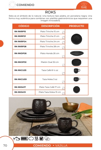 COMIENDOVAJILLACOMIENDO70ROKSPlato Trinche 21 cmPlato Trinche 28 cmPlato Hondo 26 cmPlato Taza Moka 13 cmPlat%u00f3n Oval 32 cmTaza Caf%u00e9 8 1/2 ozTaza Moka 3 ozPlato Trinche 15 cmPlato Trinche 24 cmPlato Taza Caf%u00e9 17 cmRK-RKRP21RK-RKRP28RK-RKDP26RK-RKSA13RK-RKOP32RK-RKCU25RK-RKCU09RK-RKRP15RK-RKRP24RK-RKSA17C%u00d3DIGODESCRIPCI%u00d3NPRODUCTORoks es el s%u00edmbolo de lo natural. Una textura tipo piedra, en porcelana negra. Una forma muy aut%u00e9ntica para combinar con platillos gastron%u00f3micos que requieren una imagen innovadora.1212121212121212