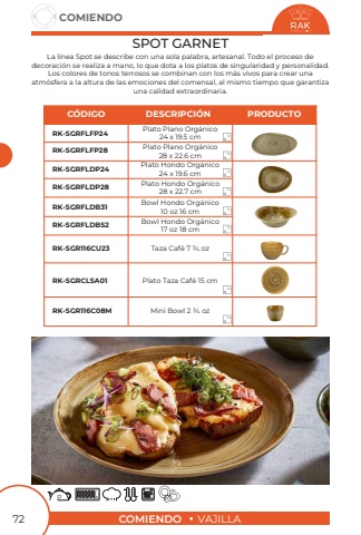 COMIENDOVAJILLACOMIENDO72SPOT GARNETLa l%u00ednea Spot se describe con una sola palabra, artesanal. Todo el proceso de decoraci%u00f3n se realiza a mano, lo que dota a los platos de singularidad y personalidad. Los colores de tonos terrosos se combinan con los m%u00e1s vivos para crear una atm%u00f3sfera a la altura de las emociones del comensal, al mismo tiempo que garantizauna calidad extraordinaria.Plato Plano Org%u00e1nico 28 x 22.6 cmBowl Hondo Org%u00e1nico 17 oz 18 cmTaza Caf%u00e9 7 3/4 ozPlato Hondo Org%u00e1nico 28 x 22.7 cmPlato Plano Org%u00e1nico 24 x 19.5 cmBowl Hondo Org%u00e1nico 10 oz 16 cmPlato Hondo Org%u00e1nico 24 x 19.6 cmPlato Taza Caf%u00e9 15 cmMini Bowl 2 3/4 ozRK-SGRFLFP28RK-SGRFLDB52RK-SGR116CU23RK-SGRFLDP28RK-SGRFLFP24RK-SGRFLDB31RK-SGRFLDP24RK-SGRCLSA01RK-SGR116C08MC%u00d3DIGODESCRIPCI%u00d3NPRODUCTO121212121212121212