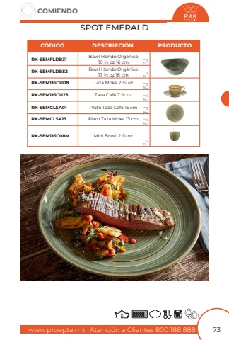 www.proepta.mxAtenci%u00f3n a Clientes 800 188 888COMIENDO73SPOT EMERALDBowl Hondo Org%u00e1nico 17 1/2 oz 18 cmTaza Caf%u00e9 7 3/4 ozPlato Taza Moka 13 cmBowl Hondo Org%u00e1nico 10 1/2 oz 16 cmTaza Moka 2 3/4 ozPlato Taza Caf%u00e9 15 cmMini Bowl 2 3/4 ozRK-SEMFLDB52RK-SEM116CU23RK-SEMCLSA13RK-SEMFLDB31RK-SEM116CU08RK-SEMCLSA01RK-SEM116C08MC%u00d3DIGODESCRIPCI%u00d3NPRODUCTO12121212121212