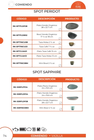 COMIENDOVAJILLACOMIENDO74SPOT PERIDOTPlato Hondo Org%u00e1nico28 x 22.7 cmBowl Hondo Org%u00e1nico17 1/2 oz 18 cmTaza Caf%u00e9 7 3/4 ozPlato Taza Moka 13 cmTaza Moka 2 3/4 ozPlato Taza Caf%u00e9 15 cmMini Bowl 2 3/4 ozRK-SPTFLDP28RK-SPTFLDB52RK-SPT116CU23RK-SPTCLSA13RK-SPT116CU08RK-SPTCLSA01RK-SPT116C08MC%u00d3DIGODESCRIPCI%u00d3NPRODUCTO12121212121212SPOT SAPPHIREPlato Hondo Org%u00e1nico28 x 22.7 cmPlato Plano Org%u00e1nico24 x 19.5 cmPlato Hondo Org%u00e1nico24 x 19.6 cmMini Bowl 2 3/4 ozRK-SSRFLDP28RK-SSRFLFP24RK-SSRFLDP24RK-SSR116C08MC%u00d3DIGODESCRIPCI%u00d3NPRODUCTO12121212