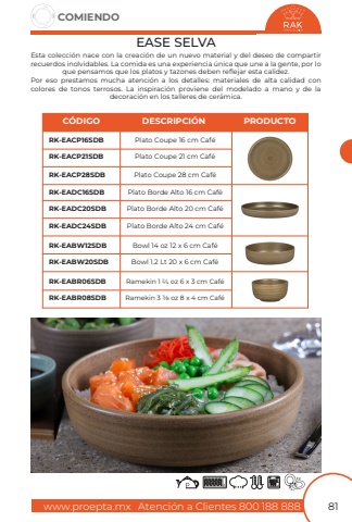 www.proepta.mxAtenci%u00f3n a Clientes 800 188 888COMIENDO81EASE SELVAEsta colecci%u00f3n nace con la creaci%u00f3n de un nuevo material y del deseo de compartir recuerdos inolvidables. La comida es una experiencia %u00fanica que une a la gente, por lo que pensamos que los platos y tazones deben reflejar esta calidez.Por eso prestamos mucha atenci%u00f3n a los detalles: materiales de alta calidad concolores de tonos terrosos. La inspiraci%u00f3n proviene del modelado a mano y de ladecoraci%u00f3n en los talleres de cer%u00e1mica.Plato Coupe 21 cm Caf%u00e9Plato Borde Alto 20 cm Caf%u00e9Bowl 1.2 Lt 20 x 6 cm Caf%u00e9Ramekin 3 3/8 oz 8 x 4 cm Caf%u00e9Plato Coupe 16 cm Caf%u00e9Plato Borde Alto 16 cm Caf%u00e9Bowl 14 oz 12 x 6 cm Caf%u00e9Ramekin 1 2/4 oz 6 x 3 cm Caf%u00e9Plato Coupe 28 cm Caf%u00e9Plato Borde Alto 24 cm Caf%u00e9RK-EACP21SDBRK-EADC20SDBRK-EABW20SDBRK-EABR08SDBRK-EACP16SDBRK-EADC16SDBRK-EABW12SDBRK-EABR06SDBRK-EACP28SDBRK-EADC24SDBC%u00d3DIGODESCRIPCI%u00d3NPRODUCTO