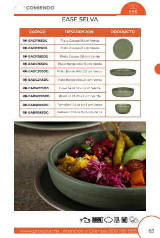www.proepta.mxAtenci%u00f3n a Clientes 800 188 888COMIENDO83EASE SELVAPlato Coupe 21 cm VerdePlato Borde Alto 20 cm VerdeBowl 1.2 Lt 20 x 6 cm VerdeRamekin 3 3/8 oz 8 x 4 cm VerdePlato Coupe 16 cm VerdePlato Borde Alto 16 cm VerdeBowl 14 oz 12 x 6 cm VerdeRamekin 1 2/4 oz 6 x 3 cm VerdePlato Coupe 28 cm VerdePlato Borde Alto 24 cm VerdeRK-EACP21SDGRK-EADC20SDGRK-EABW20SDGRK-EABR08SDGRK-EACP16SDGRK-EADC16SDGRK-EABW12SDGRK-EABR06SDGRK-EACP28SDGRK-EADC24SDGC%u00d3DIGODESCRIPCI%u00d3NPRODUCTO