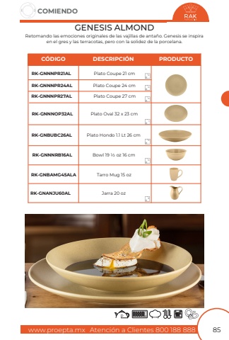 www.proepta.mxAtenci%u00f3n a Clientes 800 188 888COMIENDO85GENESIS ALMONDPlato Coupe 24 cmPlato Coupe 21 cmPlato Coupe 27 cmPlato Oval 32 x 23 cmPlato Hondo 1.1 Lt 26 cmBowl 19 1/2 oz 16 cmTarro Mug 15 ozJarra 20 ozRK-GNNNPR24ALRK-GNNNPR21ALRK-GNNNPR27ALRK-GNNNOP32ALRK-GNBUBC26ALRK-GNNNRB16ALRK-GNBAMG45ALARK-GNANJU60ALRetomando las emociones originales de las vajillas de anta%u00f1o. Genesis se inspiraen el gres y las terracotas, pero con la solidez de la porcelana.1212121212C%u00d3DIGODESCRIPCI%u00d3NPRODUCTO