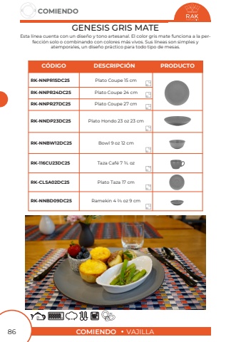 COMIENDOVAJILLACOMIENDO86GENESIS GRIS MATEPlato Coupe 24 cmPlato Coupe 15 cmPlato Coupe 27 cmPlato Hondo 23 oz 23 cmBowl 9 oz 12 cmTaza Caf%u00e9 7 3/4 ozPlato Taza 17 cmRamekin 4 2/5 oz 9 cmRK-NNPR24DC25RK-NNPR15DC25RK-NNPR27DC25RK-NNDP23DC25RK-NNBW12DC25RK-116CU23DC25RK-CLSA02DC25RK-NNBD09DC25Esta l%u00ednea cuenta con un dise%u00f1o y tono artesanal. El color gris mate funciona a la perfecci%u00f3n solo o combinando con colores m%u00e1s vivos. Sus l%u00edneas son simples y atemporales, un dise%u00f1o pr%u00e1ctico para todo tipo de mesas.1212121212121212C%u00d3DIGODESCRIPCI%u00d3NPRODUCTO
