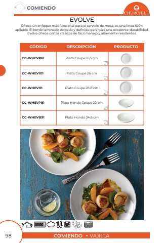 COMIENDOVAJILLACOMIENDO98EVOLVEPlato Coupe 28.8 cmPlato Coupe 26 cmPlato Hondo Coupe 22 cmPlato Hondo 24.8 cmPlato Coupe 16.5 cmCC-WHEV111CC-WHEV101CC-WHEVP81CC-WHEVB91CC-WHEVP61Ofrece un enfoque m%u00e1s funcional para el servicio de mesa, es una l%u00ednea 100% apilable. El borde laminado delgado y definido garantiza una excelente durabilidad. Evolve ofrece platos cl%u00e1sicos de f%u00e1cil manejo y altamente resistentes.C%u00d3DIGODESCRIPCI%u00d3NPRODUCTO1212121212
